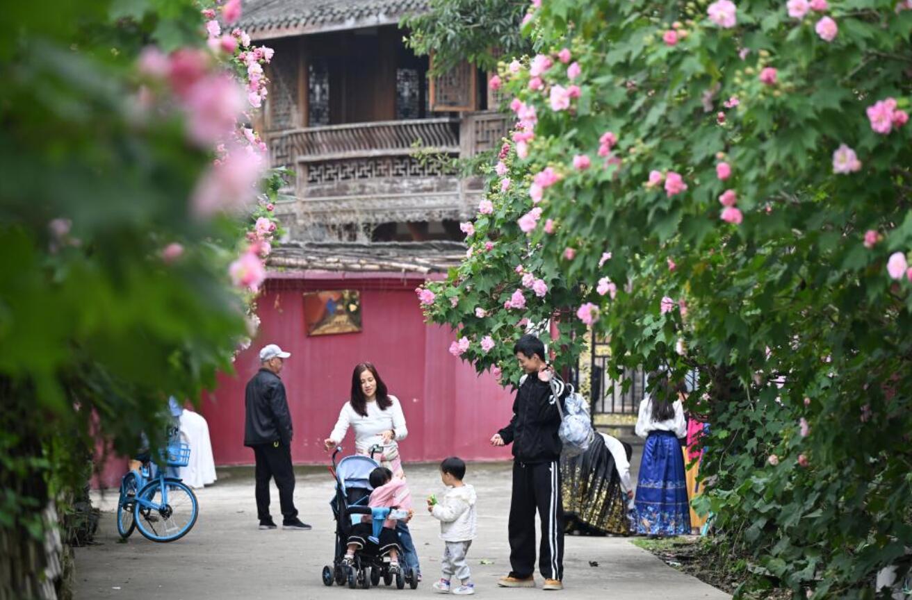 四川成都:芙蓉花扮靚紅墻黛瓦 市民打卡古風(fēng)古韻景觀